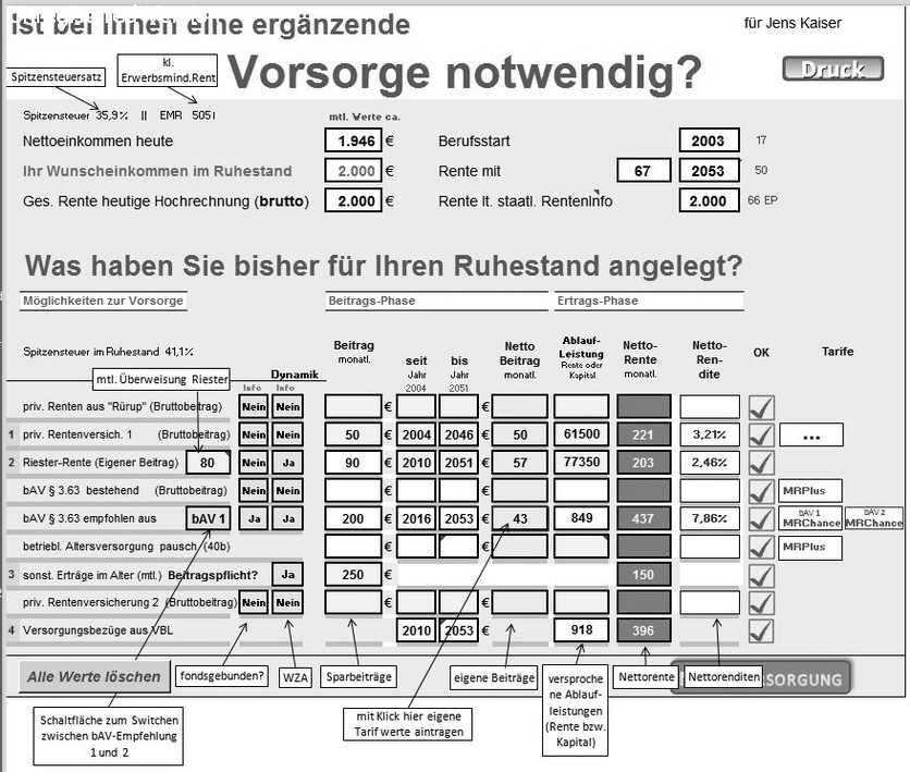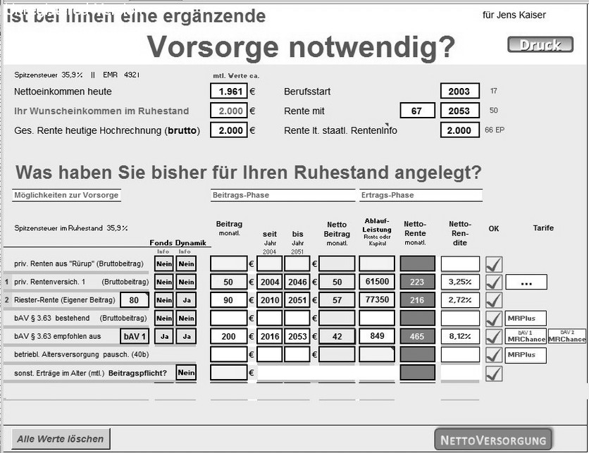 Hier können Sie jetzt eintragen, welche der möglichen Vorsorgeprodukte Ihr Mandant schon beauftragt hat.Die auf der vorherigehenden Seite angelegte bestehende bAV ist hier genauso schon vorgetragen wie Ihre beiden Alternativ-